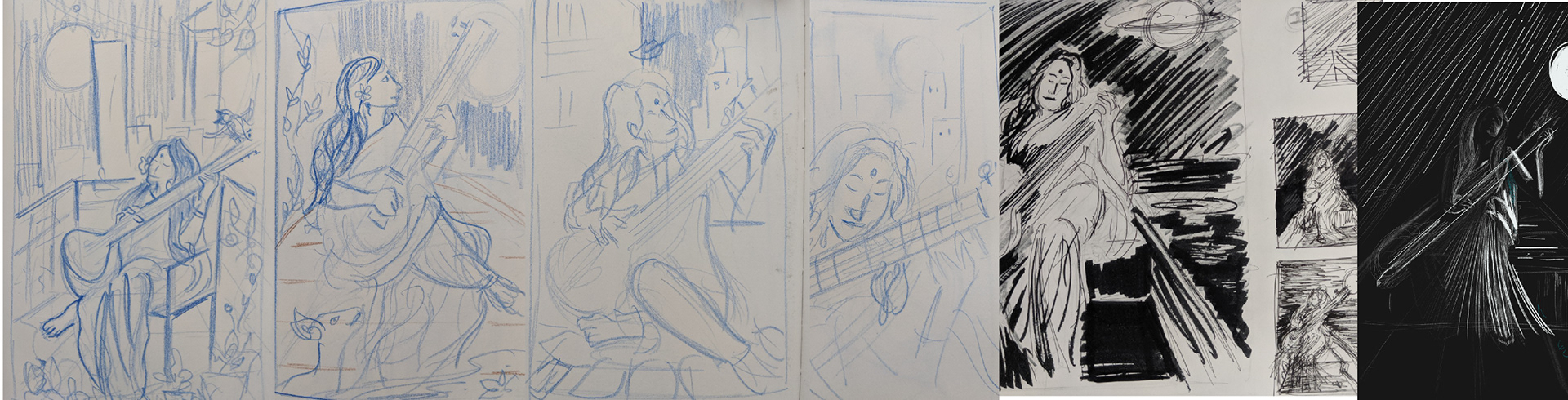 The Illustration was made for the contemporary musical sitar artist Anoushka Shankar, promoting her tour, which could to be adapted onto different collaterals, for the concert. The piece is inspired by the sitar track 'Boats to Nowhere' and depth of the sound reverberated from the instrument. The goal was to encapsulate the essence of the artist and her craft, while making it an effective piece of communication. The inspiration for the color palette to be monochromatic is drawn from the instrumental bit as it has no lyrics but the look and feel for an individual to color the interpretation.